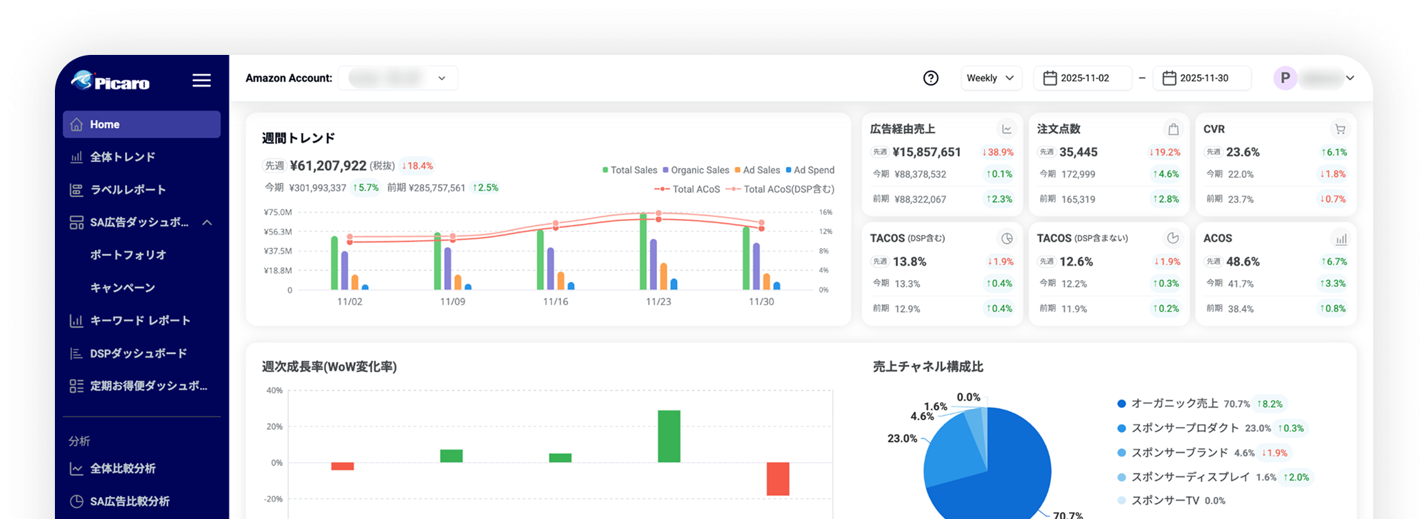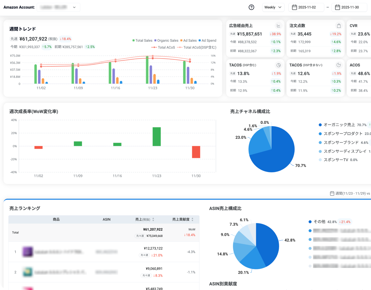商品別・キャンペーン別のWoW(前週比)/MoM(前月比)を自動で可視化します。売上が「広告によるものか」「オーガニック流入によるものか」なども同時に表示。変化の背景まで分かるので、改善ポイントを早く見つけられます。