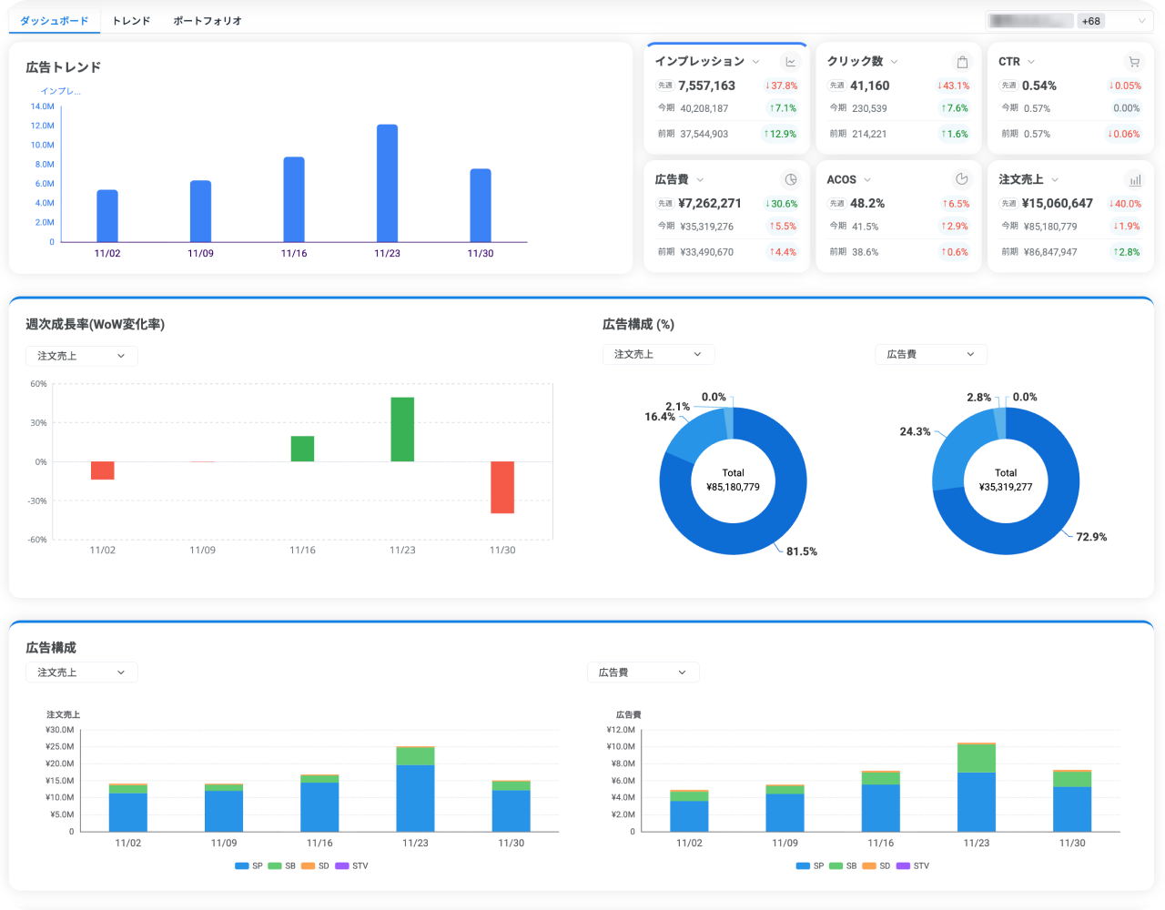 キャンペーン/ポートフォリオ単位で、ACoS・ROAS・TACoSの推移を自動で表示します。貢献度の高い施策・低い施策をハイライトで示し、改善の優先度をすぐ判断できます。最小の手間で、最大の効果を目指せる運用に変わります。