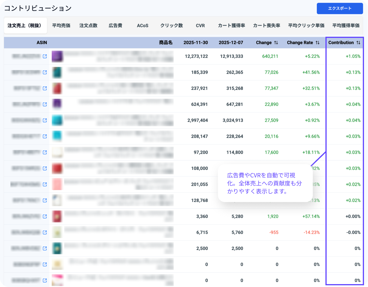 数値の増減だけではなく、「その変化が全体売上にどれほど影響したか」を自動で算出します。その結果、どの商品を優先して改善すべきかが明確に。感覚に頼らず、納得できる判断ができるようになります。