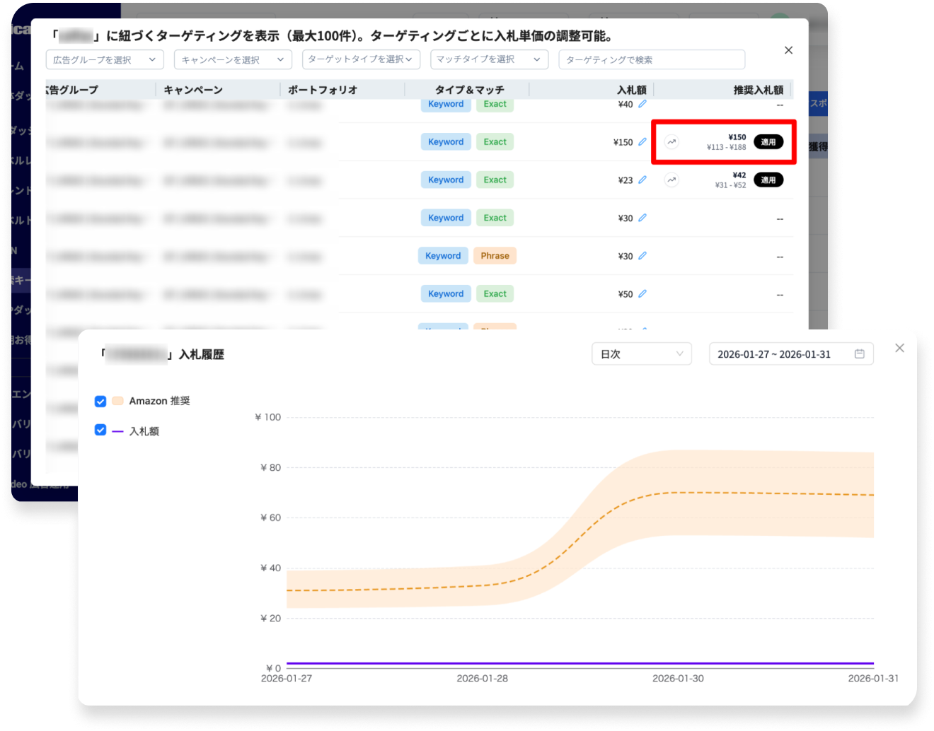 市場全体のCPC推移とImpression Share%を可視化します。アマゾン推奨単価の動きと自社実績を同時に確認できるため、「なんとなく調整」から脱却。セール前後や競合状況に合わせた、根拠ある入札戦略が立てられます。